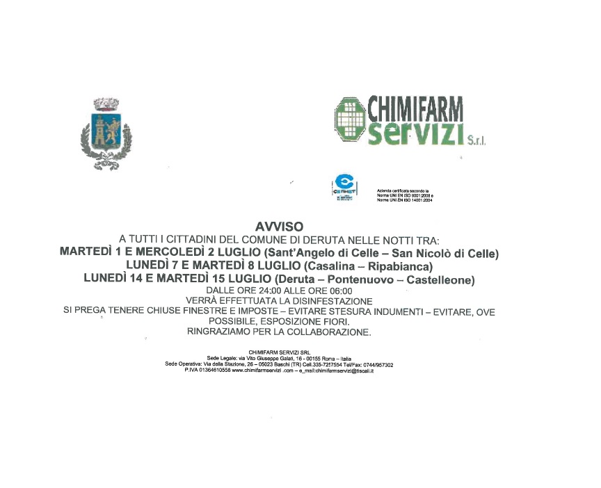 Si comunica che nei giorni 15 e 16 luglio 2020 la ditta Lupini s.r.l., incaricata del servizio, effettuerà la derattizzazione del territorio comunale.