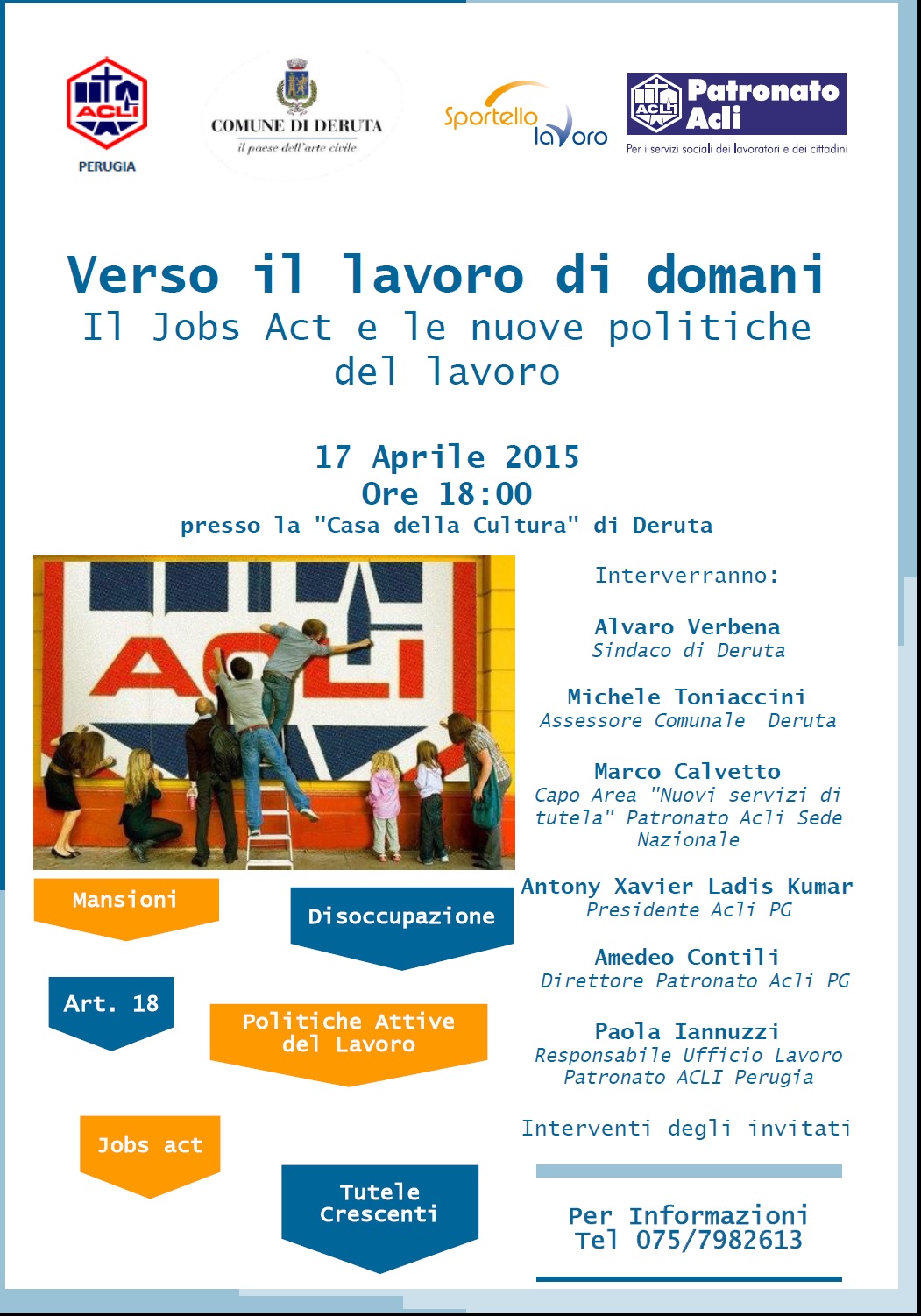 All’incontro, interverranno il Sindaco Alvaro Verbena, il Capo Area Lavoro del Patronato Acli sede Nazionale Marco Calvetto, il presidente Provinciale delle Acli Perugia Antyony Xavier Ladis Kumar, il Direttore del Patronato Acli Perugia Amedeo Contili, la responsabile dell’Ufficio Lavoro del Patronato Acli di Perugia Paola Iannuzzi e l’assessore Comunale di Deruta Michele Toniaccini che si è fatto promotore dell’Iniziativa dimostrando attenzione al mondo del lavoro e dell’associazionismo.