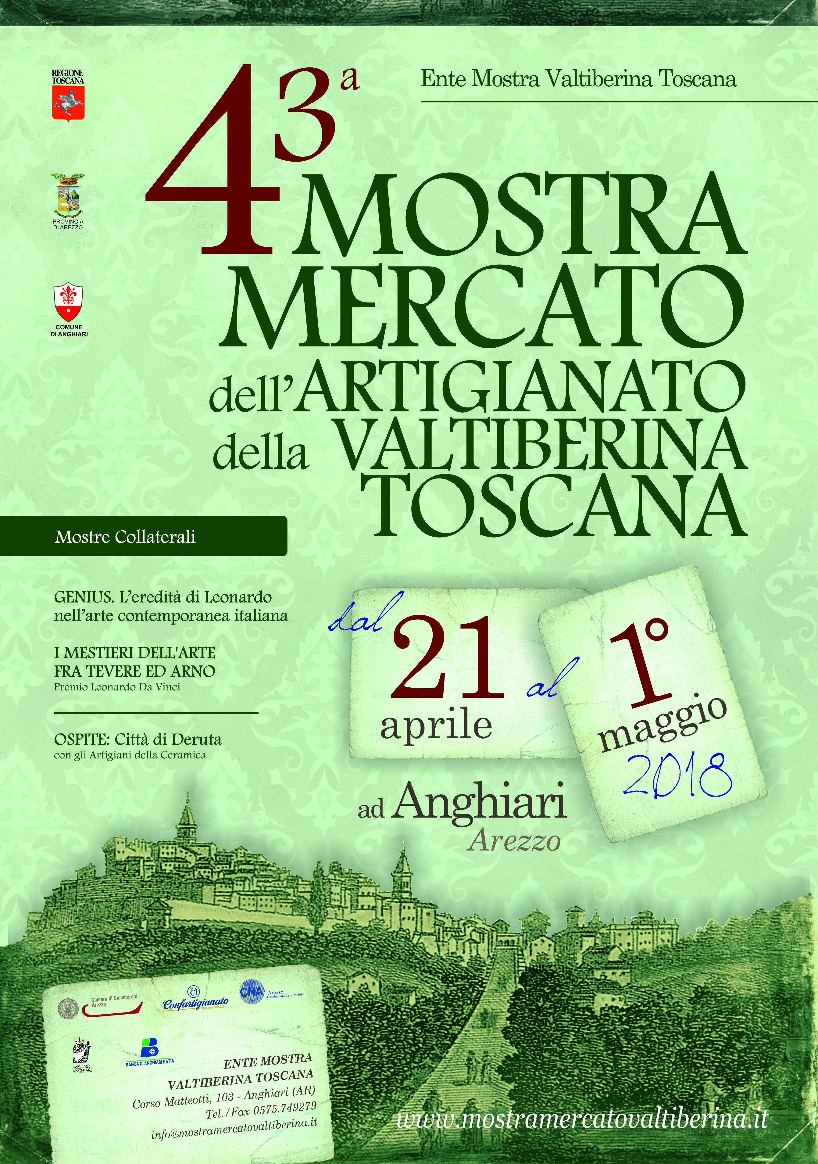 la presente per informarvi che i Presidenti dell’Associazione Pro Anghiari e della Mostra Mercato dell’Artigianato della Valtiberina Toscana hanno comunicato la disponibilità ad ospitare alcuni artigiani in rappresentanza della prestigiosa manifattura ceramica della Città di Deruta alla 43^ Mostra Mercato dell’Artigianato della Valtiberina Toscana che si terrà dal 21 aprile al 1° maggio 2018.