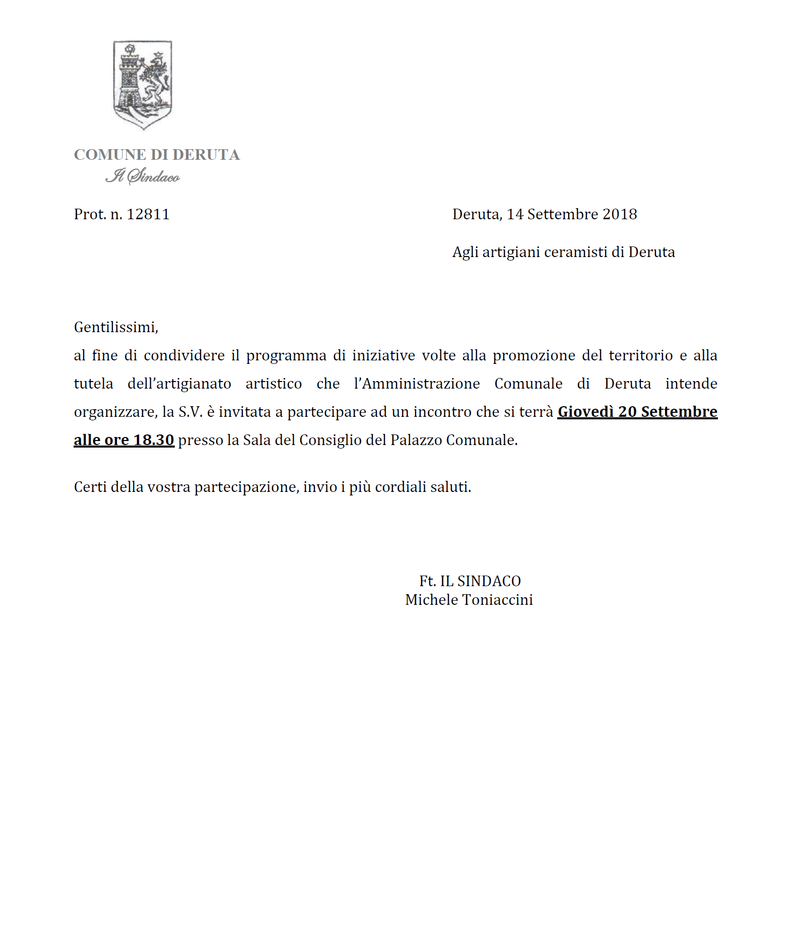 CONVOCAZIONE INCONTRO CON GLI ARTIGIANI CERAMISTI