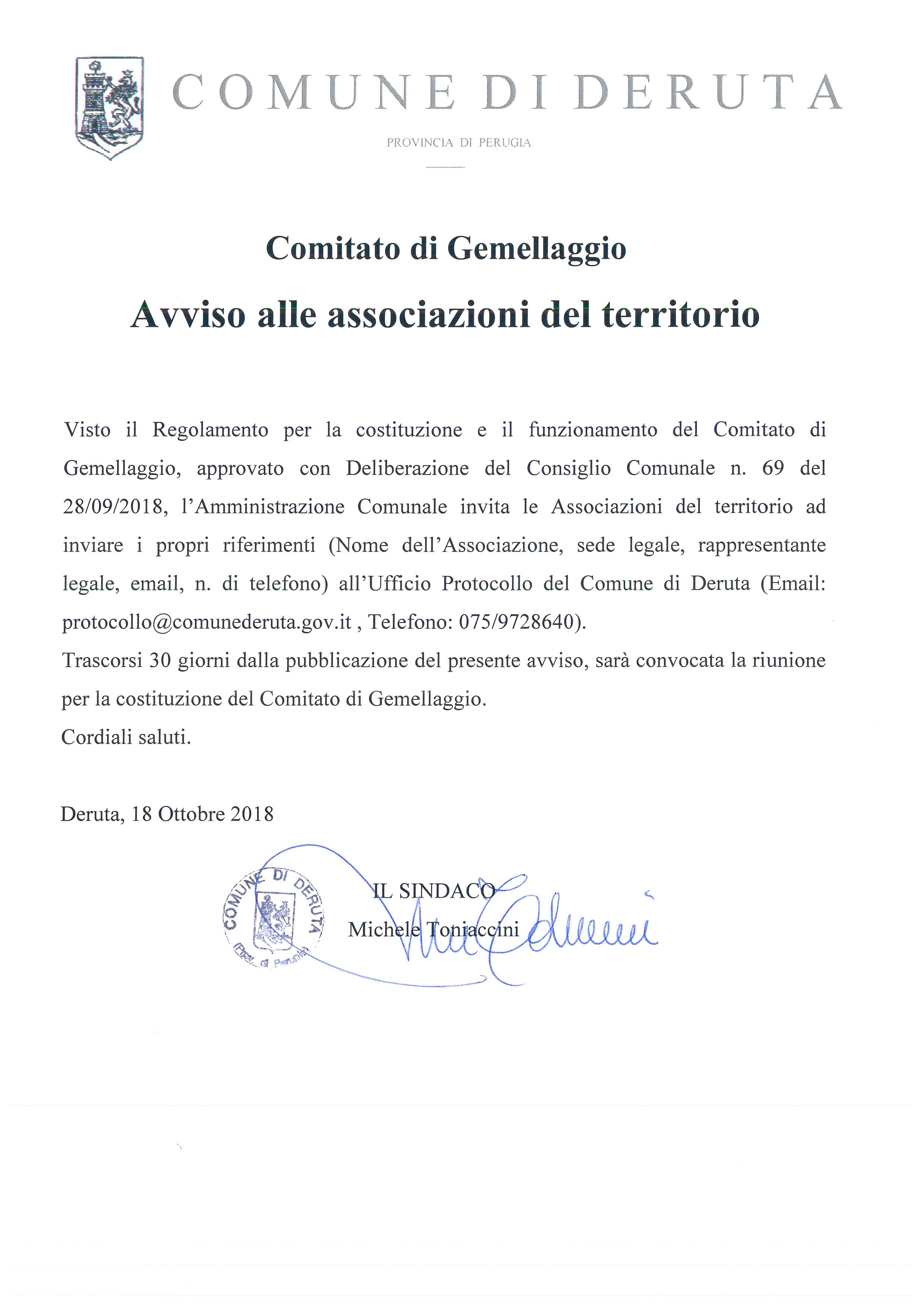 COMITATO DI GEMELLAGGIO – AVVISO ALLE ASSOCIAZIONI DEL TERRITORIO