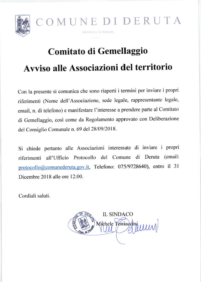 AVVISO ALLE ASSOCIAZIONI DEL TERRITORIO – COSTITUZIONE COMITATO DI GEMELLAGGIO