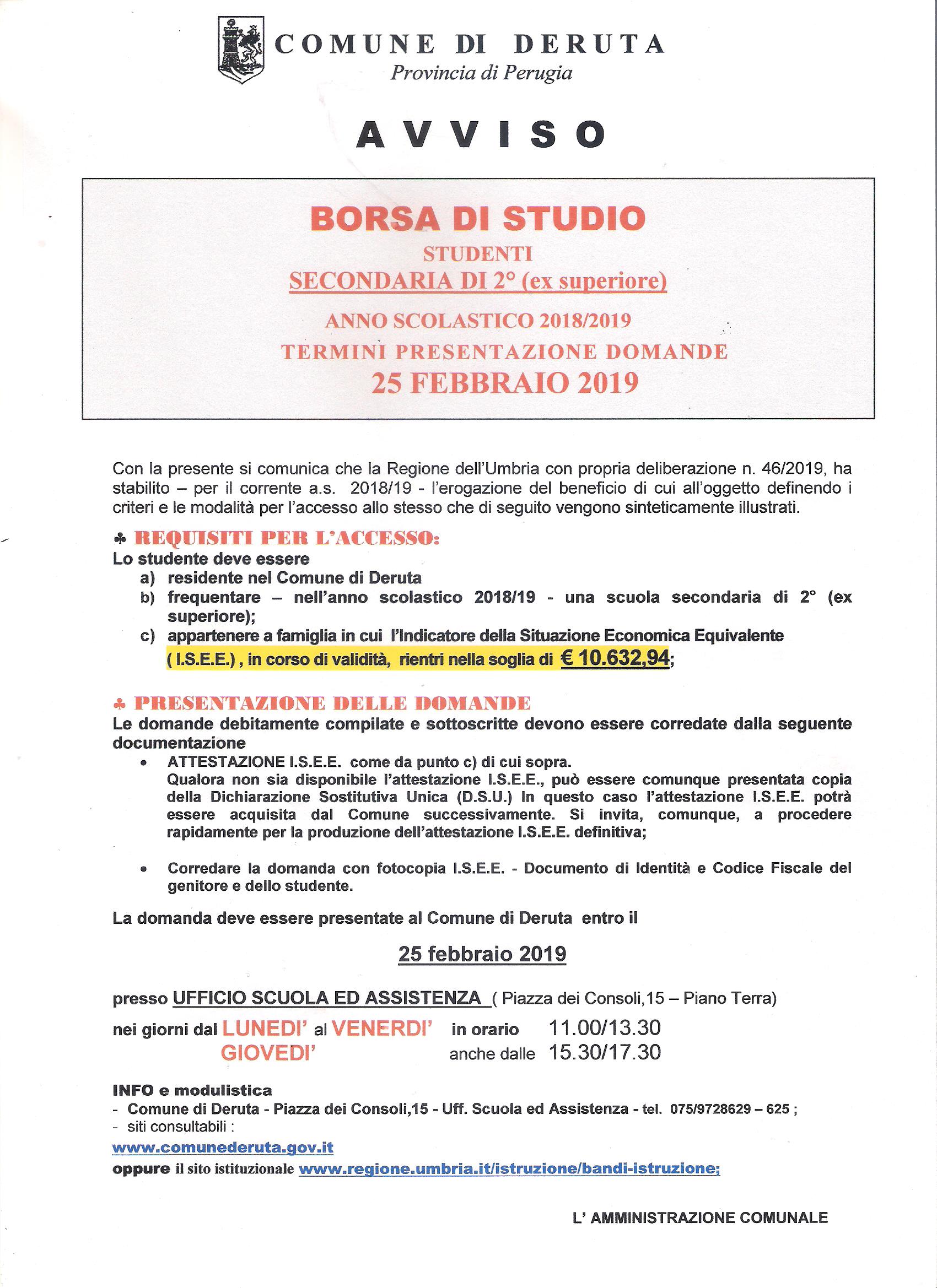 BORSA DI STUDIO 2018-19 riservata a studenti frequentanti una Scuola secondaria di 2°