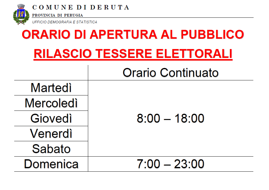 È possibile farlo presentandosi all’Ufficio Elettorale aperto con il seguente orario: