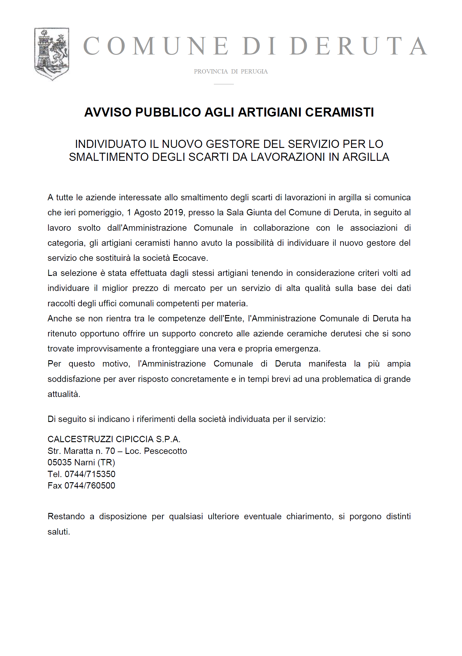 A tutte le aziende interessate allo smaltimento degli scarti di lavorazioni in argilla si comunica che ieri pomeriggio, 1 Agosto 2019, presso la Sala Giunta del Comune di Deruta, in seguito al lavoro svolto dall’Amministrazione Comunale in collaborazione con le associazioni di categoria, gli artigiani ceramisti hanno avuto la possibilità di individuare il nuovo gestore del servizio che sostituirà la società Ecocave.