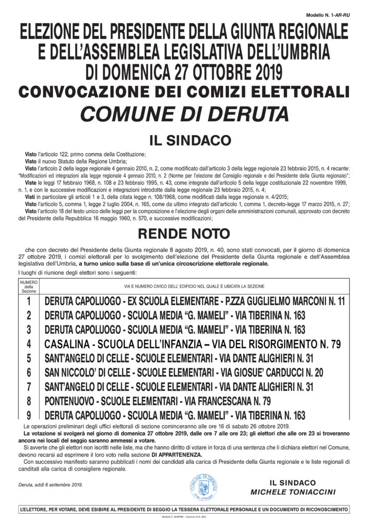Elezioni del Presidente della Giunta Regionale e dell’Assemblea Legislativa dell’Umbria di domenica 27 ottobre 2019.