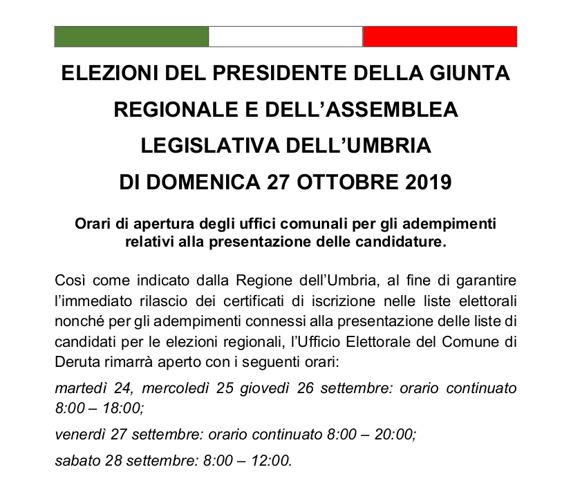 Orari di apertura degli uffici comunali per gli adempimenti relativi alla presentazione delle candidature.