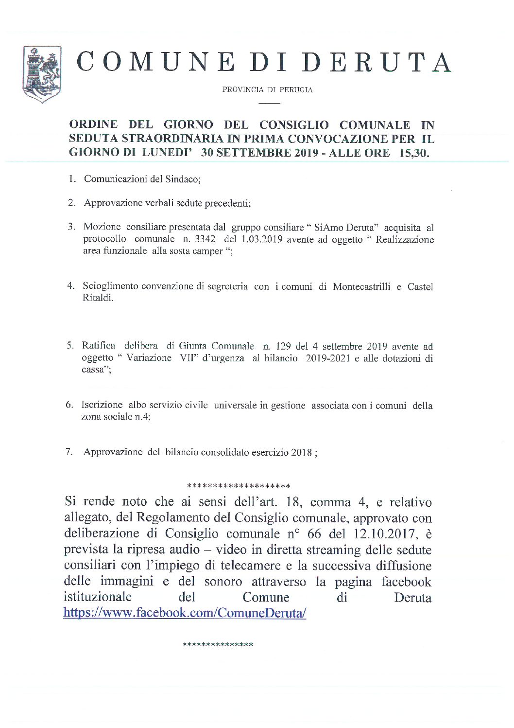 CONVOCAZIONE CONSIGLIO COMUNALE DEL 30 SETTEMBRE 2019