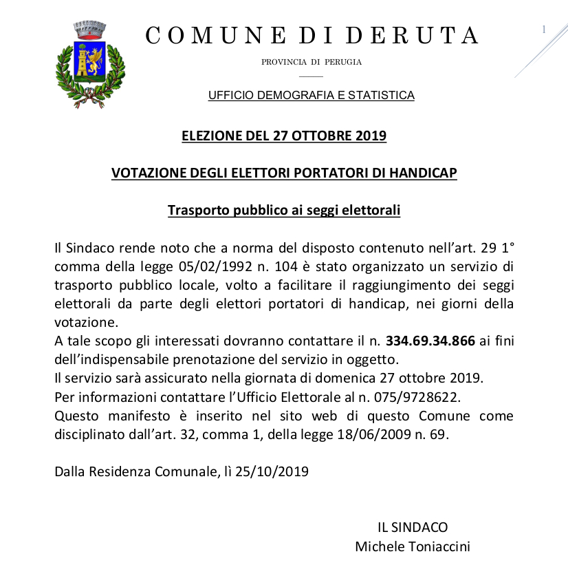 ELEZIONE DEL 27 OTTOBRE 2019 – VOTAZIONE DEGLI ELETTORI PORTATORI DI HANDICAP – Trasporto pubblico ai seggi elettorali