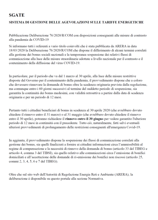 PROROGA RINNOVO BONUS GAS ELETTRICO E IDRICO