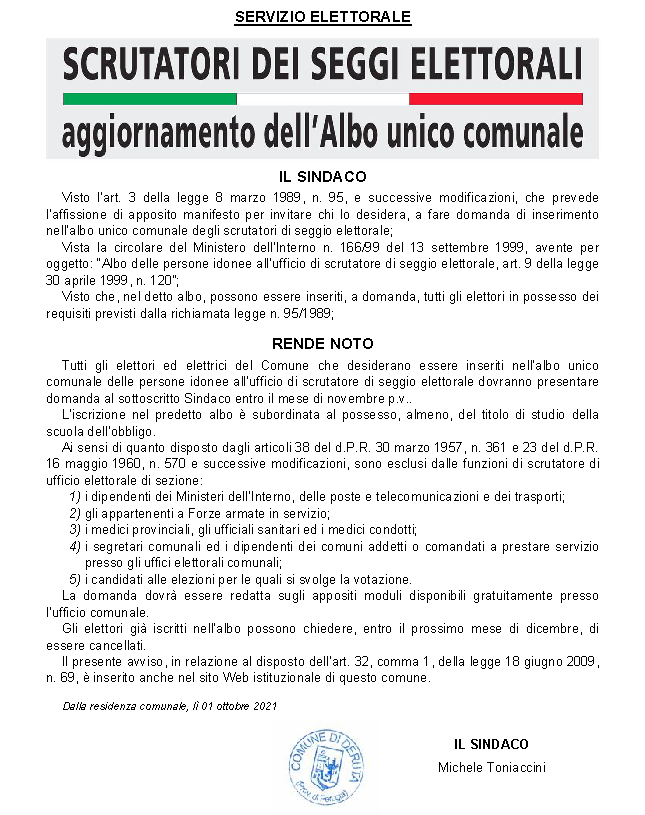 - SCRUTATORI DEI SEGGI ELETTORALI AGGIORNAMENTO DELL’ALBO UNICO COMUNALE