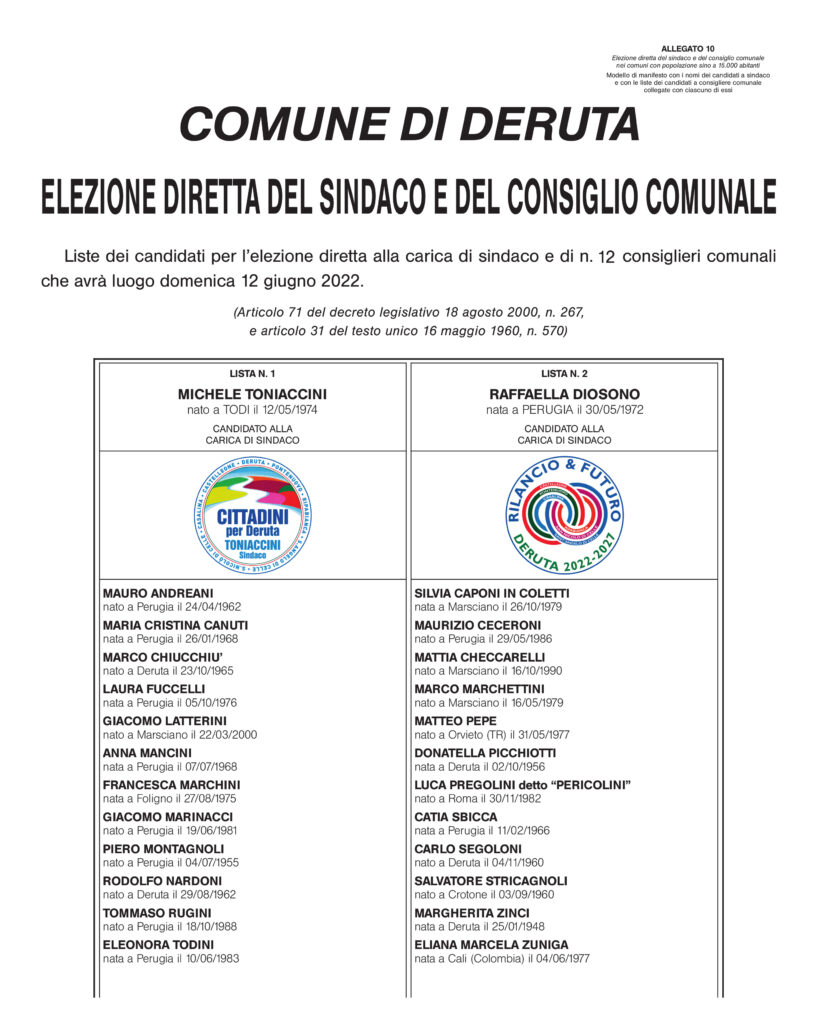 Liste dei candidati per l’elezione diretta alla carica di sindaco e di n. 12 consiglieri comunali che avrà luogo domenica 12 giugno 2022.