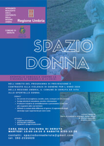 Dal mese di giugno 2024 è attivo il servizio “Spazio Donna”, uno sportello comunale contro la violenza di genere, attivato presso la Casa della Cultura nell’ambito del programma di prevenzione e contrasto alla violenza di genere per l’anno 2024 della Regione Umbria.