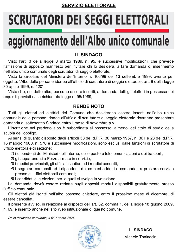 - SCRUTATORI DEI SEGGI ELETTORALI AGGIORNAMENTO DELL’ALBO UNICO COMUNALE